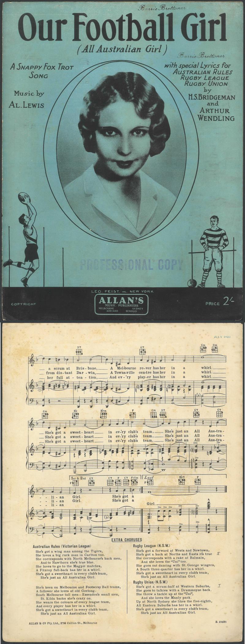 Sheet Music 'Our Football Girl (All Australian Girl)' sheet music from 1923 by Al Lewis, with special lyrics for Aussie Rules, Rugby League, and Rugby Union by HS Bridgeman and Arthur Wendling. Great lyrics! (Image1)