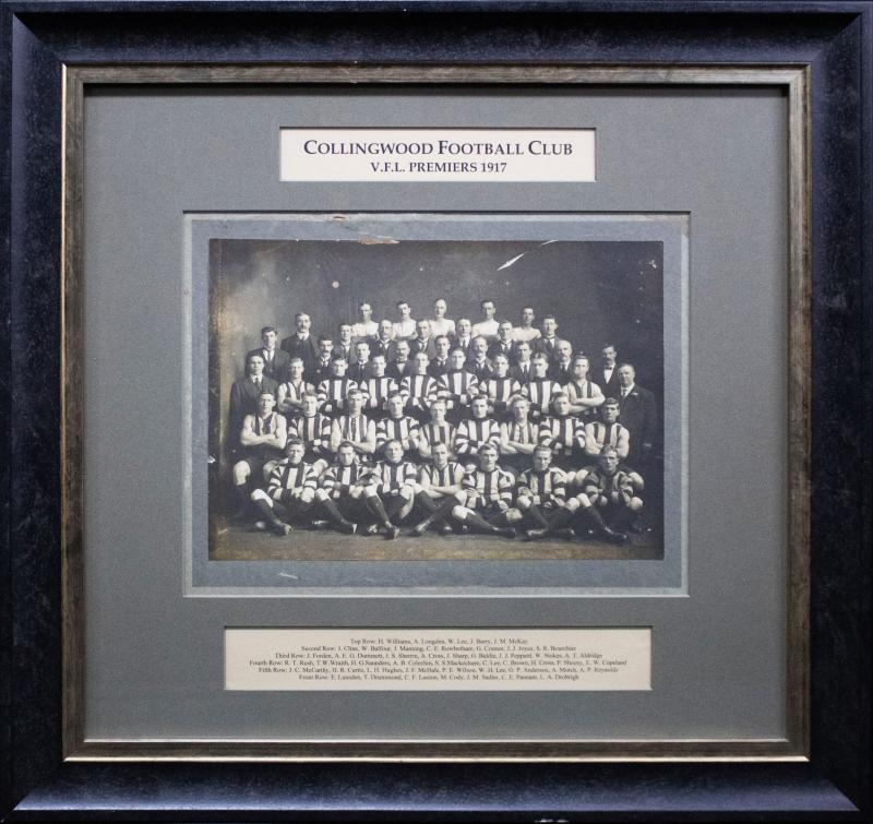 COLLINGWOOD: 1917 Premiership Team Photograph, with title 'COLLINGWOOD FOOTBALL CLUB, V.F.L. PREMIERS 1917' and players names on mount, minor faults on photograph, framed & glazed, overall 56x53cm. Ex Charles Pannam Jr, sold with his 1917 Premiership medal. [It is believed that three original team photographs survive, one being held in the Club archives] (Image1)