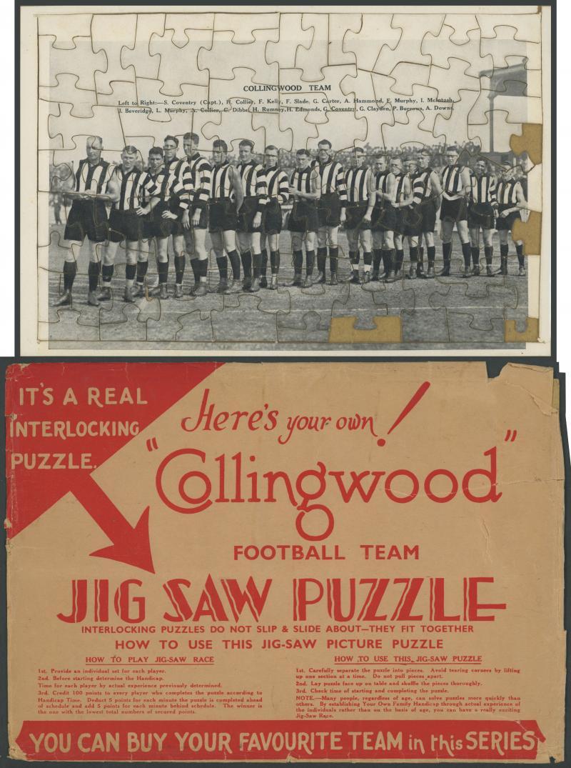 COLLINGWOOD: 1933 'Collingwood Football Team Jigsaw Puzzle', made by Valentine Publishing Co, Melbourne, four edge pieces missing but central portion intact; with original envelope (some tears), mainly Fair/Fine. The team includes Syd Coventry, Albert Collier & Gordon Coventry. (Image1)