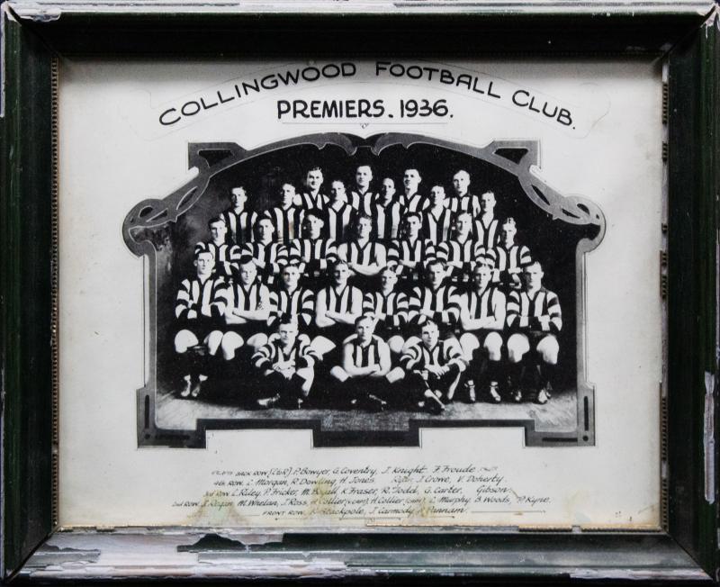 COLLINGWOOD: 1936 Premiership Team Photograph, with title 'COLLINGWOOD FOOTBALL CLUB, PREMIERS 1936' and players names within photo, framed & glazed, overall 28x23cm, minor faults at base, presented to Alby Pannam. The frame is a little knocked about, but a rare player's photograph of which only a couple have survived. [Collingwood's 11th VFL Premiership. Alby Pannam played 181 games for Collingwood 1933-1945] (Image1)