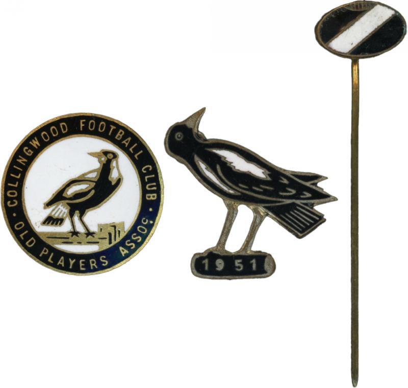 COLLINGWOOD: 1940s-2000s badges collection including 'Collingwood Football Club/Old Players Assoc'; '(magpie)/1951'; football-shaped pins (3 different); 1940s 'Denzil Don Football Club' with leather ribbons that used to be black & white, mainly Fine/Very Fine.
