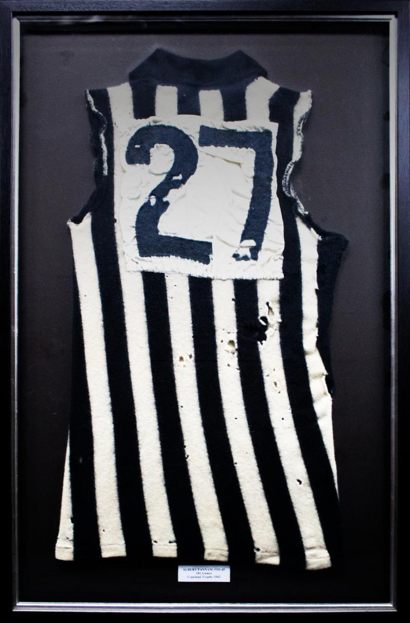 COLLINGWOOD: 1940s Collingwood jumper with number '27' on reverse, attributed to either Bill Twomey (1945), Charlie Utting (1946-1947) or Pat Twomey (1948-1949), framed & glazed, overall 67x103cm, some moth damage which may benefit from restoration. The guernsey has the characteristic thin vertical stripes which were produced in the mid 1940s. [Collingwood jumpers from this period are exceedingly rare. The club records three pre-WWI jumpers and about six pre-WWII jumpers. In 25 years of collecting, this was the earliest jumper that the vendor was able to acquire] (Image1)