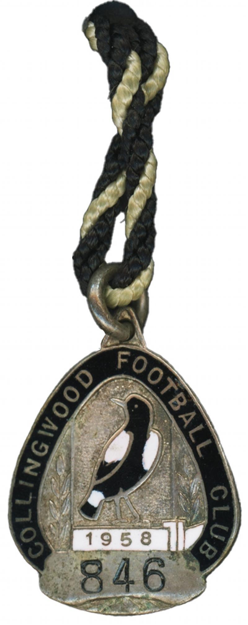 COLLINGWOOD: 'Collingwood Football Club/1958' membership badge (fourth year & Premiership year), with number "846" engraved on front. (Image1)