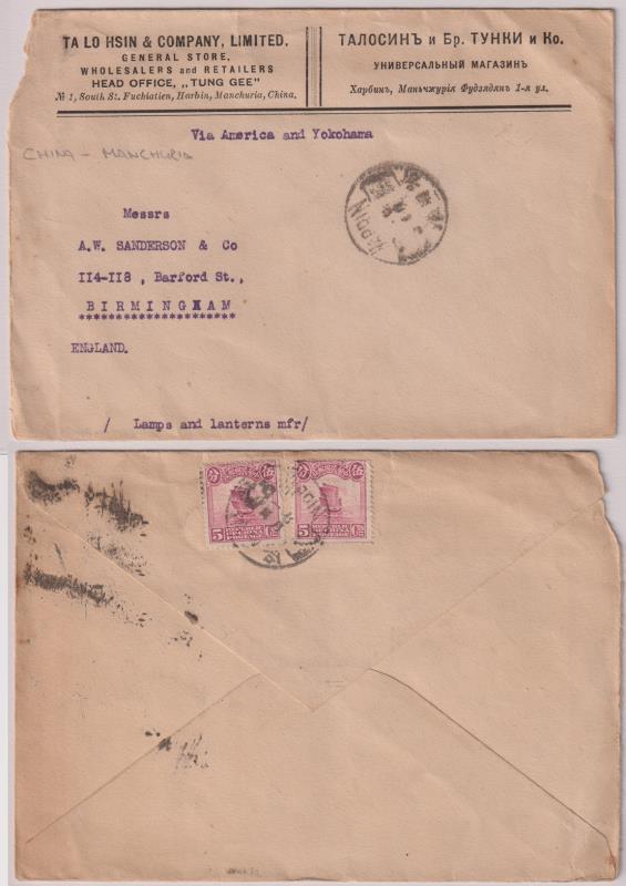 China c1915 commercial cover to England, endorsed "via America & Yokohama" bearing pair 5c Junks (1st Peking ptg) with indistinct HARBIN bilingual cds, inscribed "Lamps & Lanterns mfr" with greyish & Russian printed text. (Image)