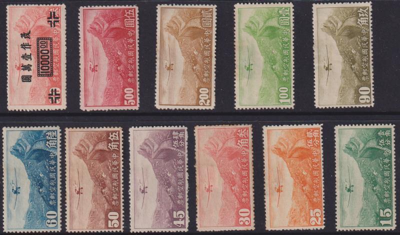 China 1932-7 Airs set of 10. Also 1948 $10,000 on 30c. Some minor perf toning. SG C11-20, C54. Cat US$27.30. Mint. (Image)