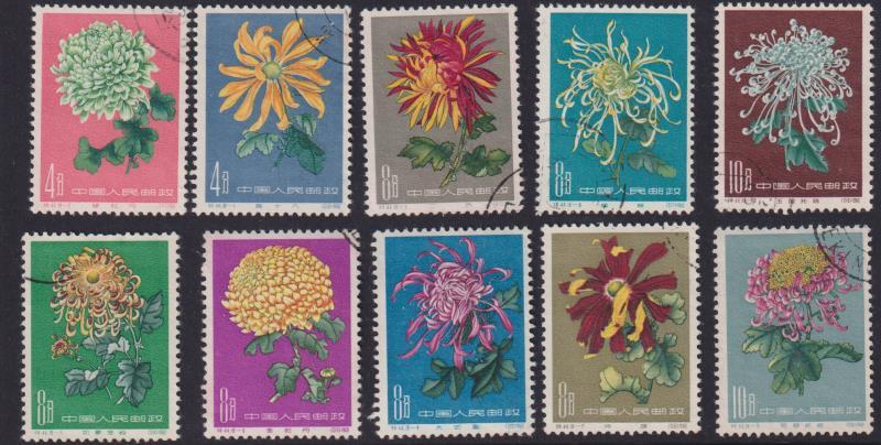 China 1960 Chrysanthemums short set of 10 to 10f. Scott 542-51. Cat US$38. FU. (Image)