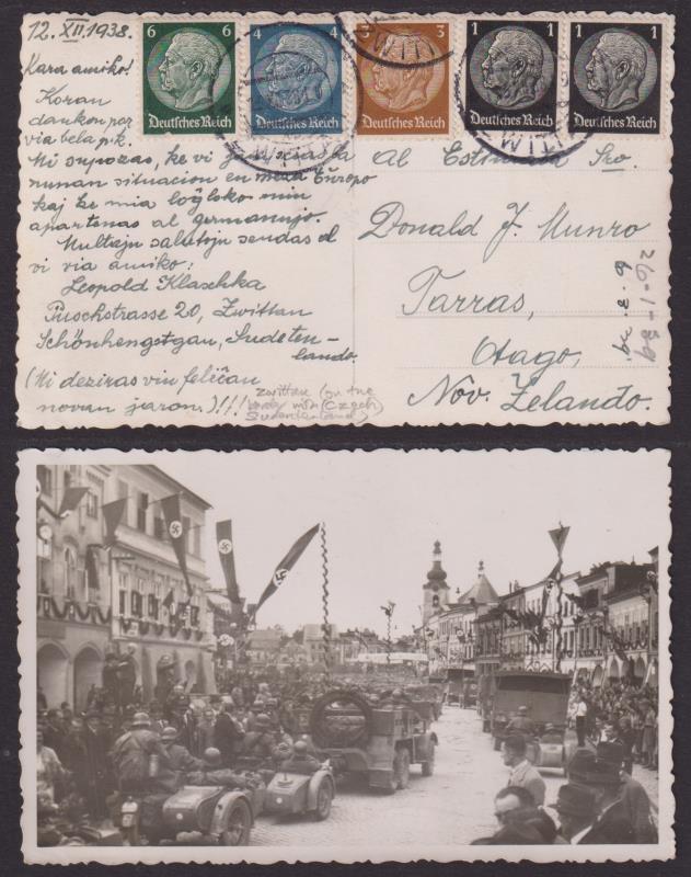 Germany 1938 real photo PPC (no caption) to NZ (message in Esperanto), franked Pres Hindenburg 6pf, 4pf, 3pf, 2 x 1pf canc Zwittau cds 13.12.38. PPC shows German military vehicles passing through Zwittau, on the border with Sudetenland (part of Czechoslo (Image)