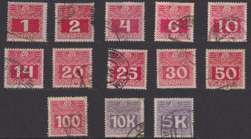 Austria 1908 1h-10Kr Postage Dues set. SG D210 etc. Cat £53+. FU. (Image)