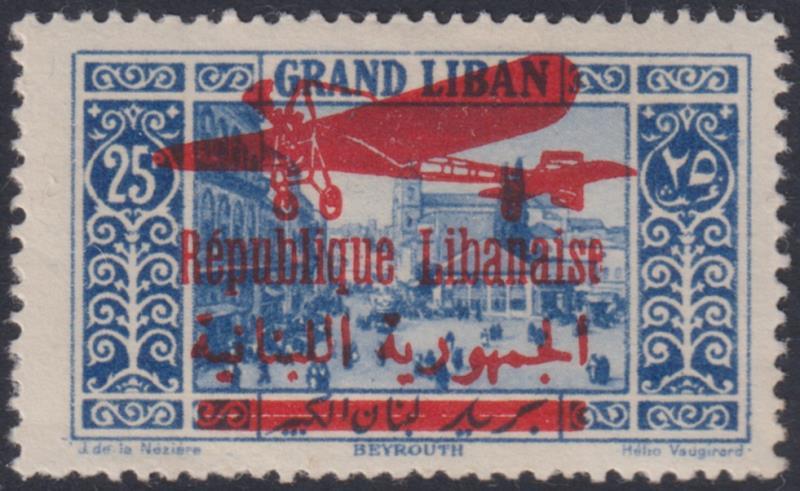 Lebanon 1928 25P red airmail ovpt (Bleriot monoplane over bilingual French & Arabic) text (on 1925 Beirut view). Top value. SG 156. Cat £225. Mint. (Image)