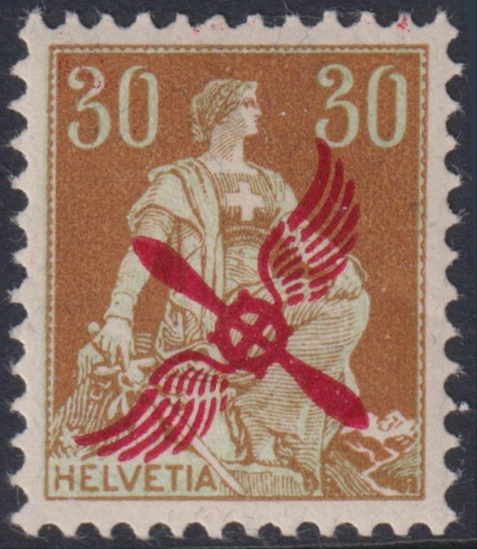 Switzerland 1919 30c Air yellow-brown & pale green (red wings & propeller ovpt on Helvetia). SG 302. Cat £170. LH mint. (Image)
