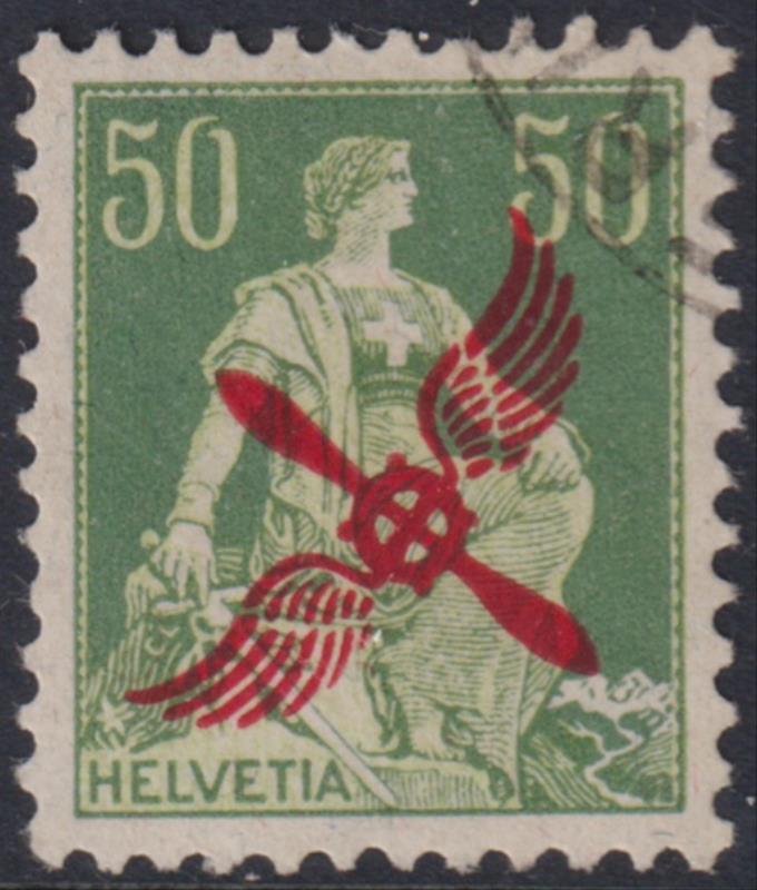 Switzerland 1919 50c Air deep green & yellow green (red wings & propeller ovpt on Helvetia). SG 303. Cat £180. FU. (Image)