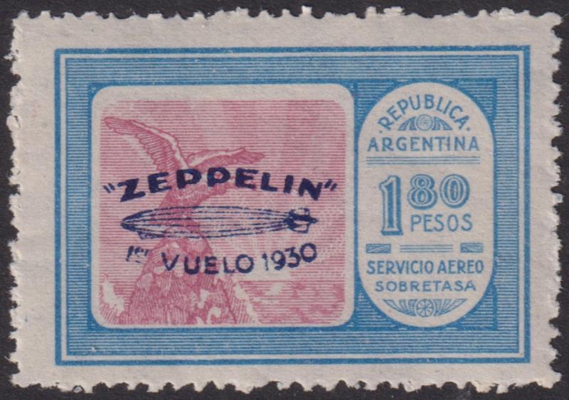 Argentina 1930 1P80c Airship "Zeppelin" Trans-Atlantic Flight: "Zeppelin ler Vuelo 1930" pictorial ovpt on 1928 Air (condor on mountain top) red & blue. SG 585. Cat £85. LH mint. (Image)
