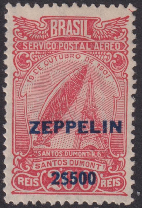 Brazil 1931 "ZEPPELIN 2$500" ovpt on 1929 200R Air red. SG 508. Cat £27. Mint. (Image)