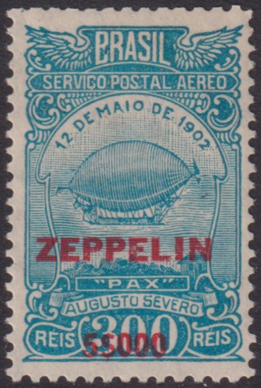 Brazil 1931 "ZEPPELIN 5$000" ovpt on 1929 300R Air blue. SG 509. Cat £35. Mint. (Image)