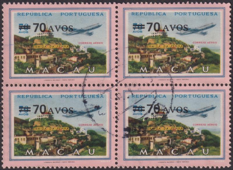 Macao 1979 70A on 76A Airmail block of 4 (Boeing 707 aircraft over Ermida da Penha), multicoloured (central cds). SG 540. Cat £42. FU. (Image)