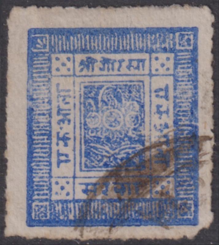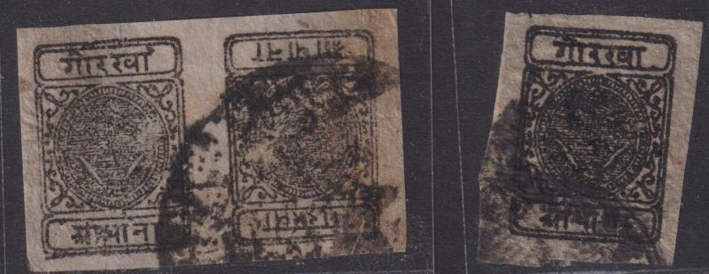Nepal 1917-30 2a black horiz tête-bêche pair & single, both with telegraph cancels. Single is intense black, a fine example. SG 34 & 34a. Cat £8.25 & £43. (Image)