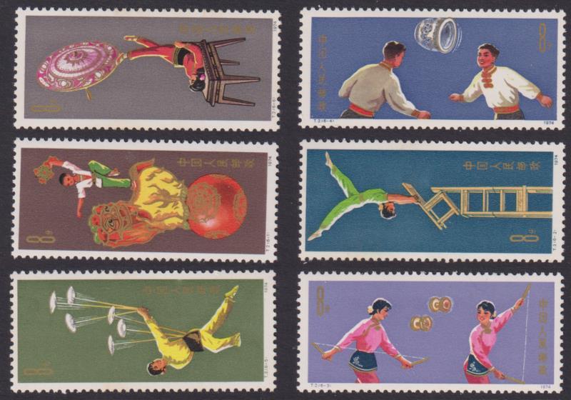China 1974 Acrobatics set, odd one slight perf tone. SG 2555-60. Cat £38. MUH. (Image)