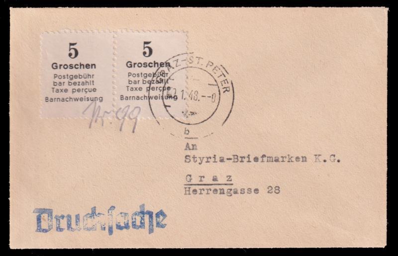 Austria 1948 small plain envelope franked pair 5 groschen emergency local stamps (simple black typeset design, perforated), canc Graz-St. Peter cds 9.1.48. Typed local address (stamp dealer), with "Drucsache" h/s (= printed matter) & pencil m/s "Nr. 99". (Image)