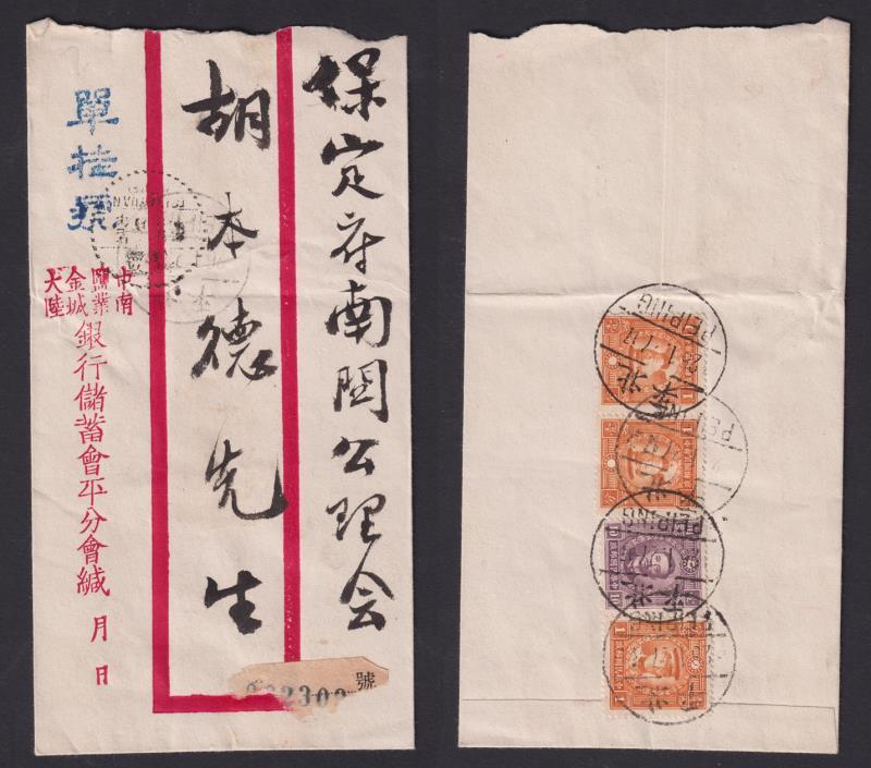 China 1938 1c x 3 & 10c Martyrs on reg'd Peiping cover, with PEIPING "21.1.7" bilingual cds, with bank chop & red h/s re closing of bank account & part reg'n label on front. (Image)
