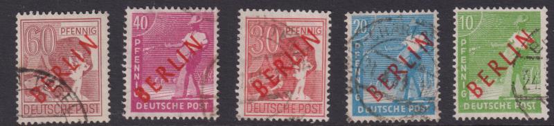 Germany-West Berlin 1948 10pf, 20pf, 30pf, 40pf & 60pf red "BERLIN" ovpts. SG cat £36+. FU. (Image)