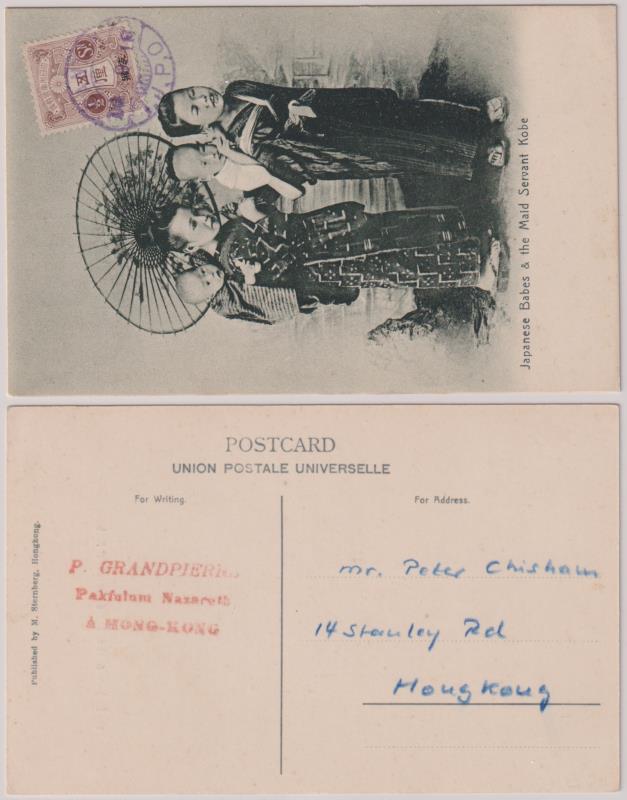 Japanese Post Offices in China 1918 PPC (Japanese Babes & the Main Servant Kobe) with ½s adhesives (on view side) cancelled CANTON/14.9.18/I.J.P.O to Hong Kong. VF condition. (Image)
