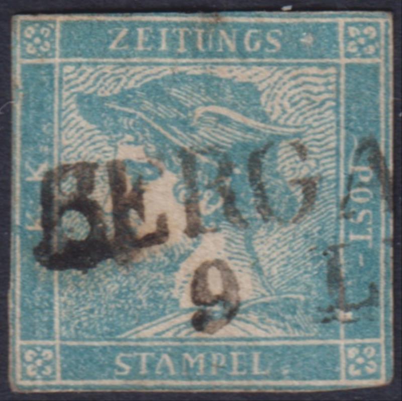 Austria 1851 (6Kr) "Mercury" pale blue newspaper stamp, type I, imperf, ribbed paper, cut close all round. Partial "BERGA[MO]" straight-line pmk. SG N11a. Cat £425. Used. (Image)