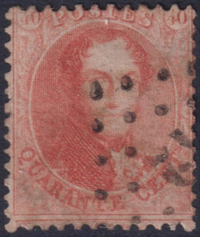 Belgium 1864 40c King Leopold carmine-rose, no wmk, p12½ x 13¼. SG 23. Cat £39. FU. (Image)