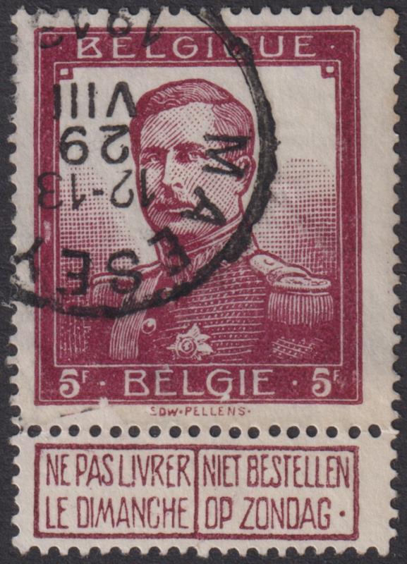 Belgium 1912 5Fr King Albert claret, with tab at base. Top value. SG 143. Cat £46. FU. (Image)