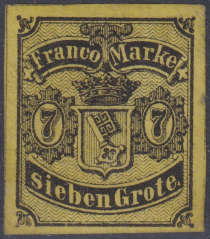 Germany-Bremen 1860 7gr black on yellow, imperf 4 margins. Very light back thin. SG 4. Cat £400. Unused no gum. (Image)