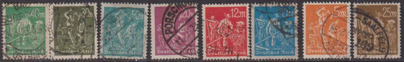 Germany 1922-3 5Mk-50Mk Miners/Farmers set of 8, mostly FU. SG 249-256. Cat £225. (Image)