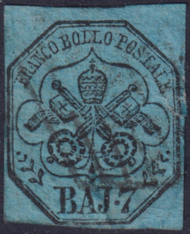 Italy-Papal States 1852 7b Arms black on blue, imperf 4 margins, back thin & small closed tear. SG 25. Cat £130. FU. (Image)