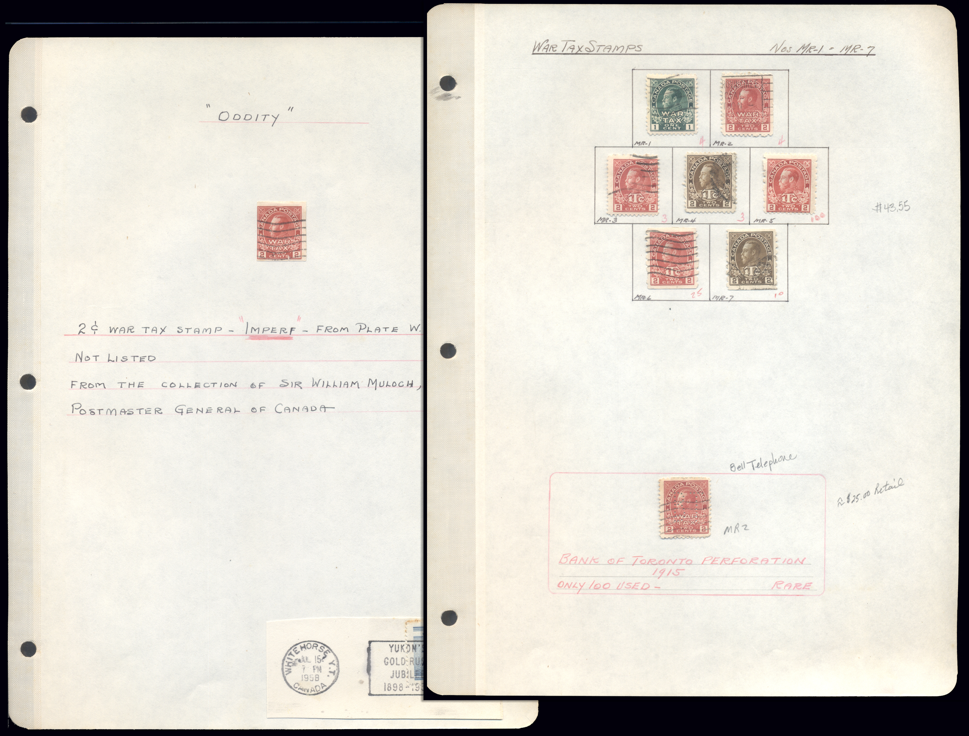Canada MR1-7+, Miscellaneous Back of Book Remainder Lot of (78), F-VF, mostly postally used, with a few Unused, but hinged to page. Includes War Tax stamps, booklet pane strips of (3) and singles, revenues, postal stationary cut squares, pre-ccls, Meter stamp cut squares, Quebec pre-ccl errors and an MR2 imperf stated to be from the collection of Sir William Muloch - a former PMG of Canada. (Not verified by SHP) (Image)