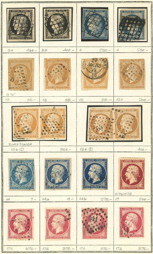 Lot of classic stamps on 4 pages of an old approvals book, it includes good values and some interesting cancels. Mixed quality, some examples with small faults (a short margin or pulled perfs, etc), and others of very fine quality. VERY HIGH CATALOG VALUE, good opportunity! IMPORTANT: please view ALL the photos of the lot, because all the stamps have been scanned. (Image)