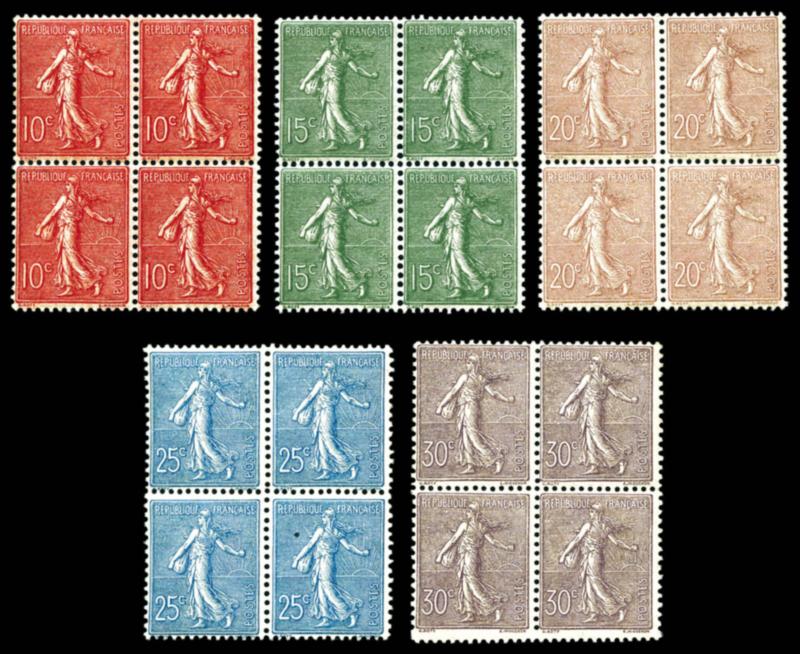 N°129/133, Série Semeuse lignée, les 5 valeurs en blocs de 4 (n°133 2 ex*). TTB (certificat) Qualité: ** Cote: 3460 euros (Image)