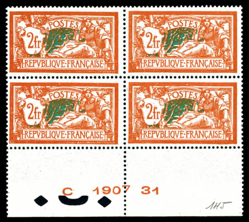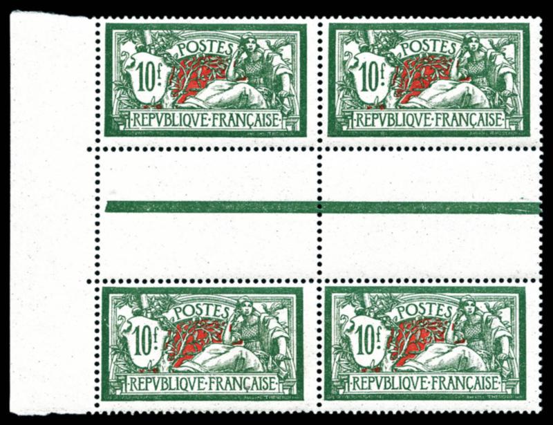 N°207, Merson, 10f vert et rouge en bloc de quatre avec interpanneaux. SUP. (certificat) Qualité: ** Cote: 1600 euros (Image)