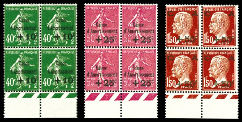 N°253/255, Caisse d'Amortissement de 1929 en blocs de 4 bdf. TTB Qualité: ** Cote: 1100 euros (Image)
