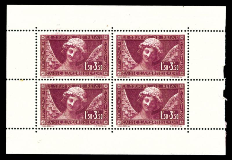 N°256a, Sourire de Reims: 1F50 +3F50 lilas bloc de quatre provenant de carnet, TB Qualité: ** Cote: 660 euros (Image)