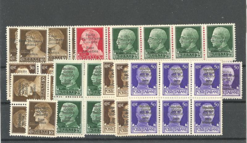 FRANCE. BASE NAVALE ITALIENNE. ** Nos 1(5), 3(5), 4(4), 5(5), 6(5), 8(5), 10 à 12 (6), en bandes ou blocs, infimes adhér. sur qqs ex. - TB (cote Yvert : 3405€) (Image)