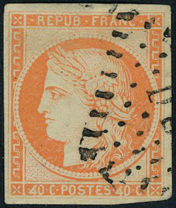 N° 5d, 40c orange, chiffre 4 retouchés, obl. légère qui dégage bien la variété - TB, signé + certificat Brun (Image)