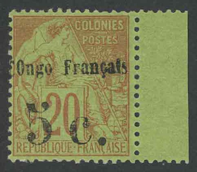 CONGO: 1892 Surcharges on French Colonies General Issues 'C0ngo Francais/ 5c. ' on 20c red/green SG 5 (Dallay 4), marginal example from the right of the sheet, large-part original gum, Cat £1700 (€1350). Samuel Gautré Certificate (2019) notes "signé Brun/Calves/certificat". (Image1)