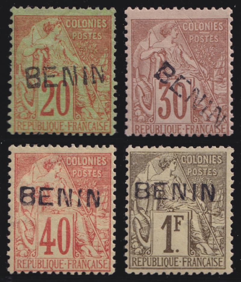 DAHOMEY: 1892 Handstamped 'BENIN' in black on French Colonies General Issues 1c to 1fr plus 15c with handstamp in red SG 1-13 plus 6c (Dallay 1-4, 8-12 & 26-29 plus 3B), centring & condition variable, some with a few short perfs, the 1c & 75c (thinned) unused, the others with large-part original gum & hinge remainders, four with guarantee handstamps & the 1fr (tiny thin) signed Scheller in pencil on the reverse, Cat £2975 (€2875). Offered 'as is'.