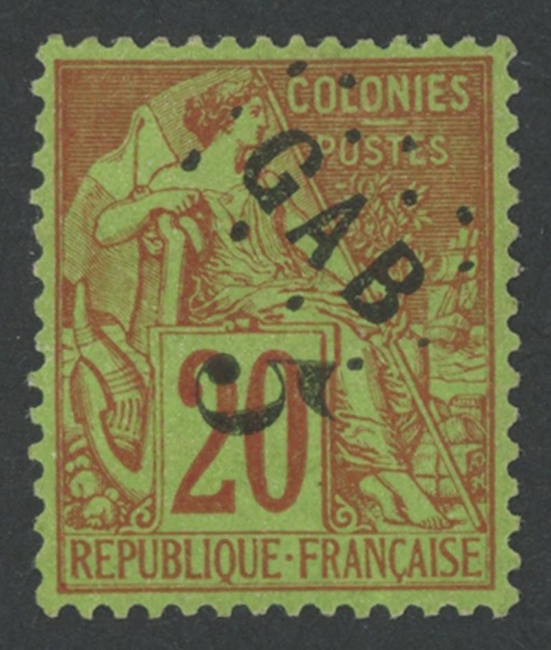 GABON: 1886 Handstamped Surcharges on French Colonies General Issues 'GAB/ 5 ' on 20c red/green SG 1 (Dallay 1), well-centred, part gum with hinge remainders & small adhesions, Cat £650 (€600). Jean Claude Fourcaut Certificate (2014) and Octave Poumet guarantee handstamp on reverse. (Image1)