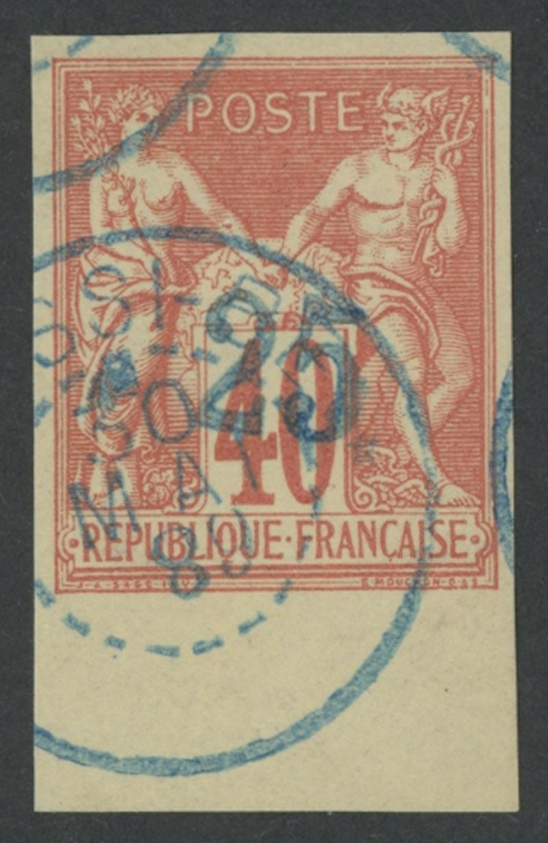 MADAGASCAR - NOSSI BE: 1889 Handstamped Surcharges in blue on French Colonies General Issues '25' on Imperforate 40c red/yellow SG 8 (Dallay 5), good even margins with sheet margin at base, large-part very fine '[NO]SSI-BE' cds cancel in blue, Cat £1000 (€1100). Straphil Certificate (2015) notes "signe Marquelet et Calves". (Image1)