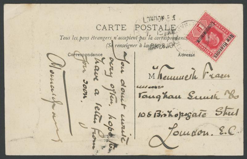 NEW HEBRIDES: 1910 usage of New Caledonia PPC ('Canaque de Koungounia') to London with Overprints on Fiji 1d red tied by French 'NLLES HEBRIDES/PT SANDWICH' cds, part-London arrival on the face. Hals & Collas state at page 145 that late usage is of questionable authenticity. However, the London arrival indicates that the card did pass through the mail. (Image1)