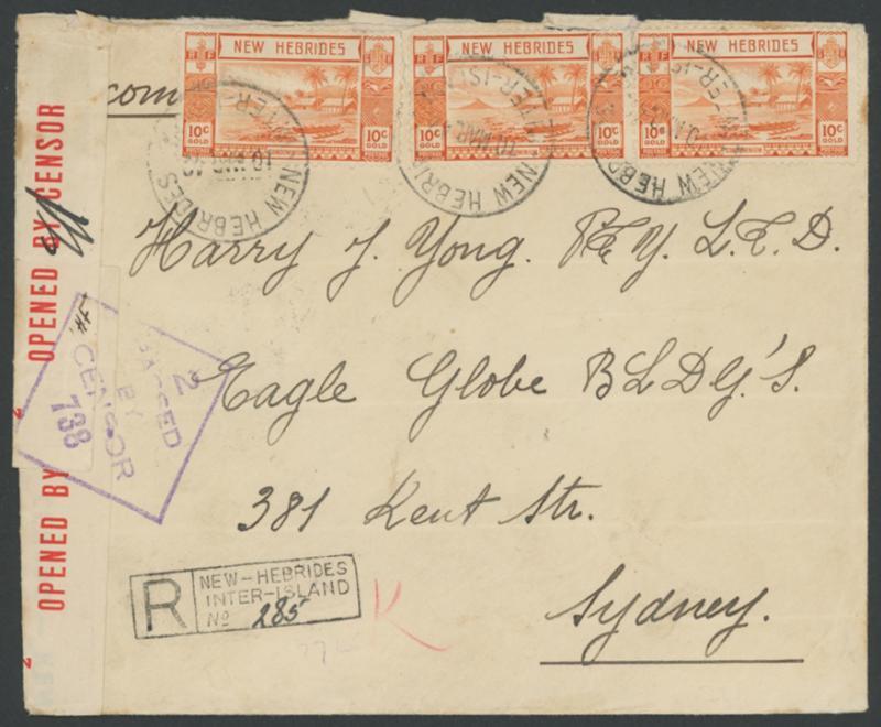 NEW HEBRIDES: 1942 (March 10) envelope to Sydney with Gold Currency 10c orange x3 tied by 'NEW HEBRIDES/INTER-ISLAND' cds, very fine complete strike of the scarce 'R/NEW-HEBRIDES/INTER-ISLAND' boxed registration handstamp at lower-left, 'NEW HEBRIDES/17 MAR 42/VILA' transit and Sydney '-2AP42' arrival backstamp where censored with resealing label & cachet, a few minor edge faults. (Image1)