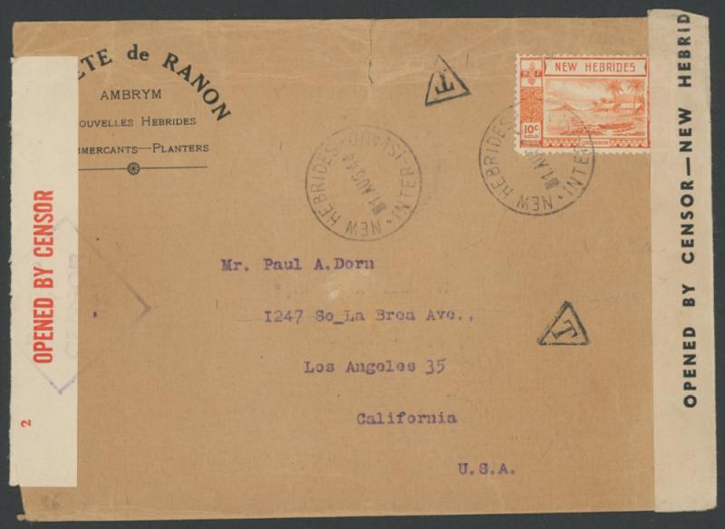 NEW HEBRIDES: 1944 (Aug 1) Societe de Ranon, Ambryn [Island], Merchants & Planters envelope to USA with Gold Currency 10c orange solo tied by 'NEW HEBRIDES/INTER-ISLAND' cds with another very fine complete strike alongside, underpaid and taxed with two very fine strikes of 'T'-in-inverted-triangle handstamp on the face, censored locally with 'OPENED BY CENSOR - NEW HEBRID[ES]' black/cream label at right and again in transit with Sydney label & cachet, a few minor edge faults. (Image1)