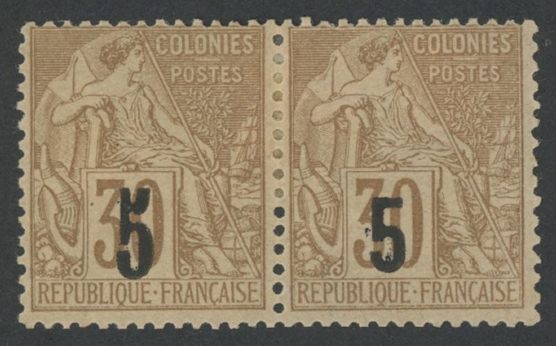 SENEGAL: 1887 Surcharges on French Colonies General Issues '5' Type 2 & Type 3 (Dallay Type II & Type III) on 30c cinnamon/drab se-tenant horizontal pair SG 2a & 2b (Dallay 2 II & 2 III), large-part original gum with minor hinge remainder & adhesions, Cat £1875+ (€2050+) for singles. Samuel Gautré Certificate (2015) states "rare et superbe (signé/certificat)". (Image1)
