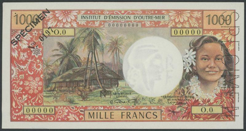 1967 Specimens New Caledonia (Noumea), New Hebrides (Nouvelles-Hebrides), & Tahiti (Papeete) comprising Postel-Vinay /Clappier 100 francs, 500 francs (New Caledonia & Tahiti only), and 1000 francs, all perforated 'SPECIMEN' at right and overprinted 'SPECIMEN/No.0185', '0189' or '0197' with serials '00000000', traces of handling, aUnc/Unc.