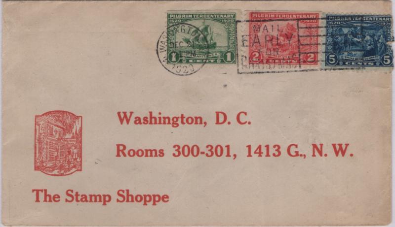 548-550 Pilgrim set on single The Stamp Shoppe FDC, Washington, D.C., 5¢ stamp damaged at right, still very hard space to fill (Image)