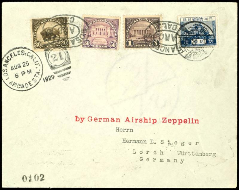 World round flight 1929, Japanese incoming line to the United States to the stage Lot-Angeles - Friedrichshafen, letter from Tokio with 10 S and with regularer post to Lot-Angeles, postage stamps added with 30 and 50 C and $ 1 as USA post with the airship further transported, without flight stamp, arrival Friedrichshafen 4.9. Reverse, superb, only 16 covers registered (winner 31 m) (Si.31m) (Image 1)(Image)